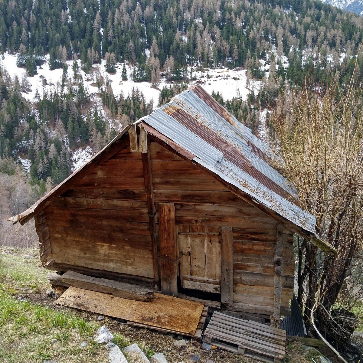 Il s’agit d’une grange en mauvaise état de conservation sur le point de s’écrouler. La fondation en pierre doit être consolidée et les madriers doivent être réassemblés.